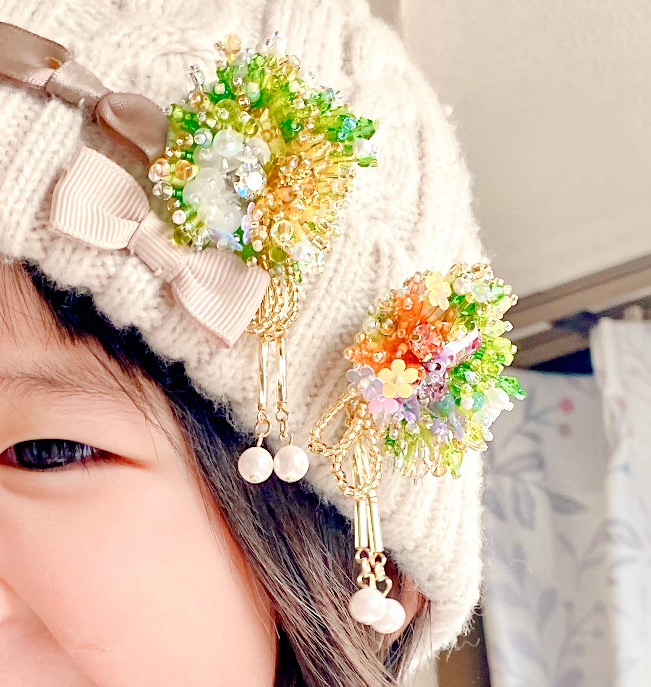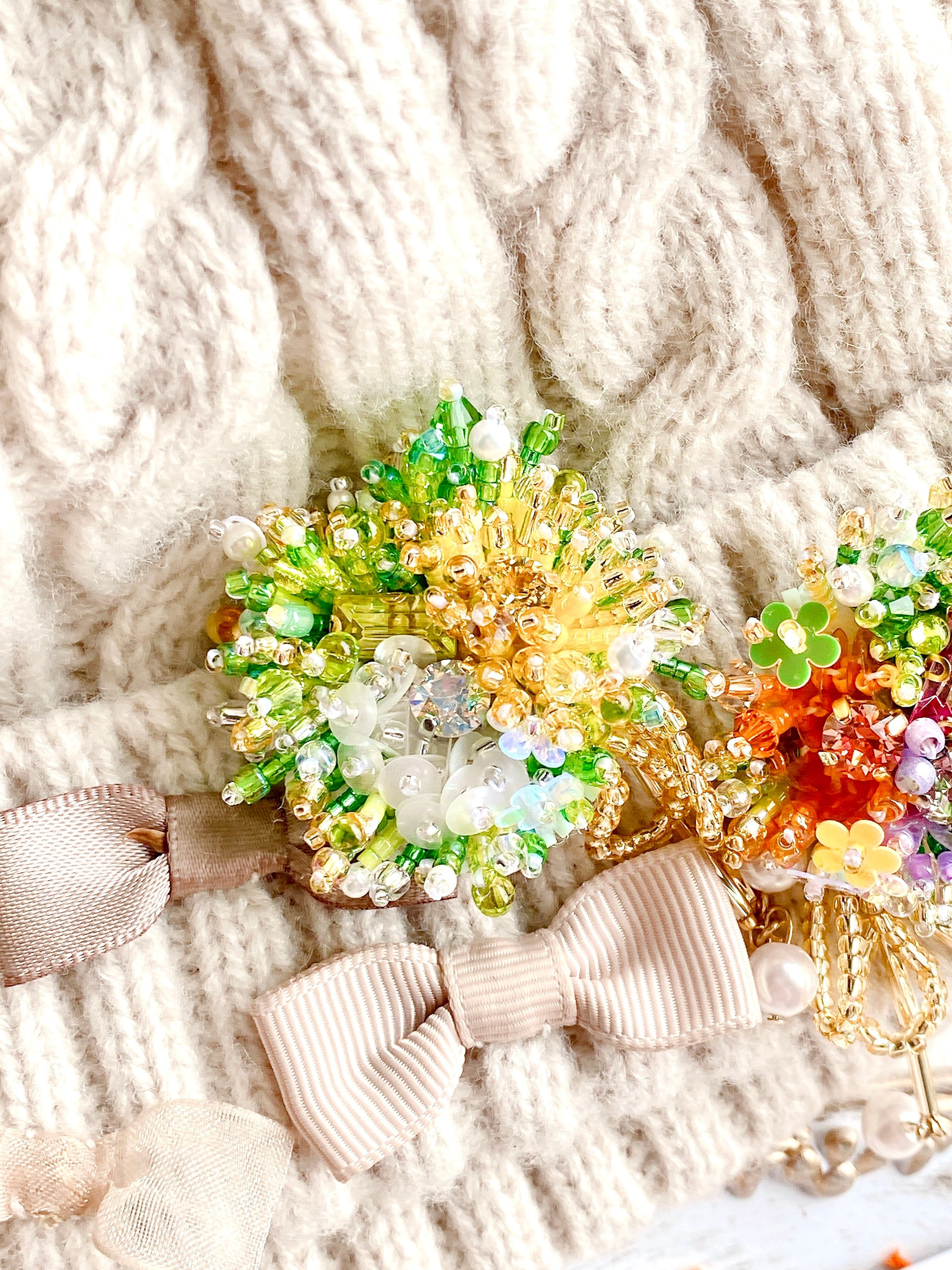 ビーズやパールを繊細に組み合わせ、光が当たるたびにキラキラと輝くデザインに仕上げました。ヘアアクセサリーとしても、ブローチとしてもお使いただけます。