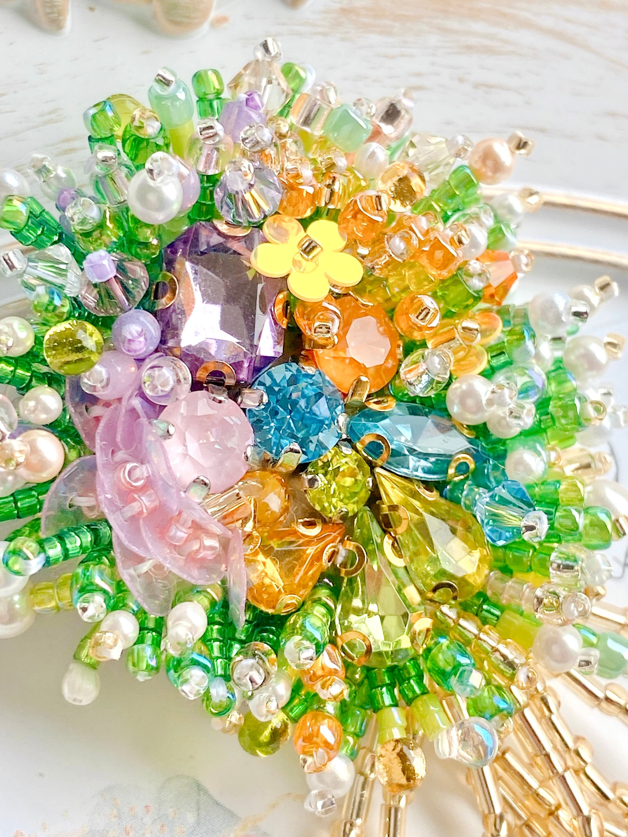 グリーン、ピンク、オレンジ、ブルーなどの繊細なビーズを丁寧に刺繍し、まるで光を浴びた草花のような輝きを演出しています。