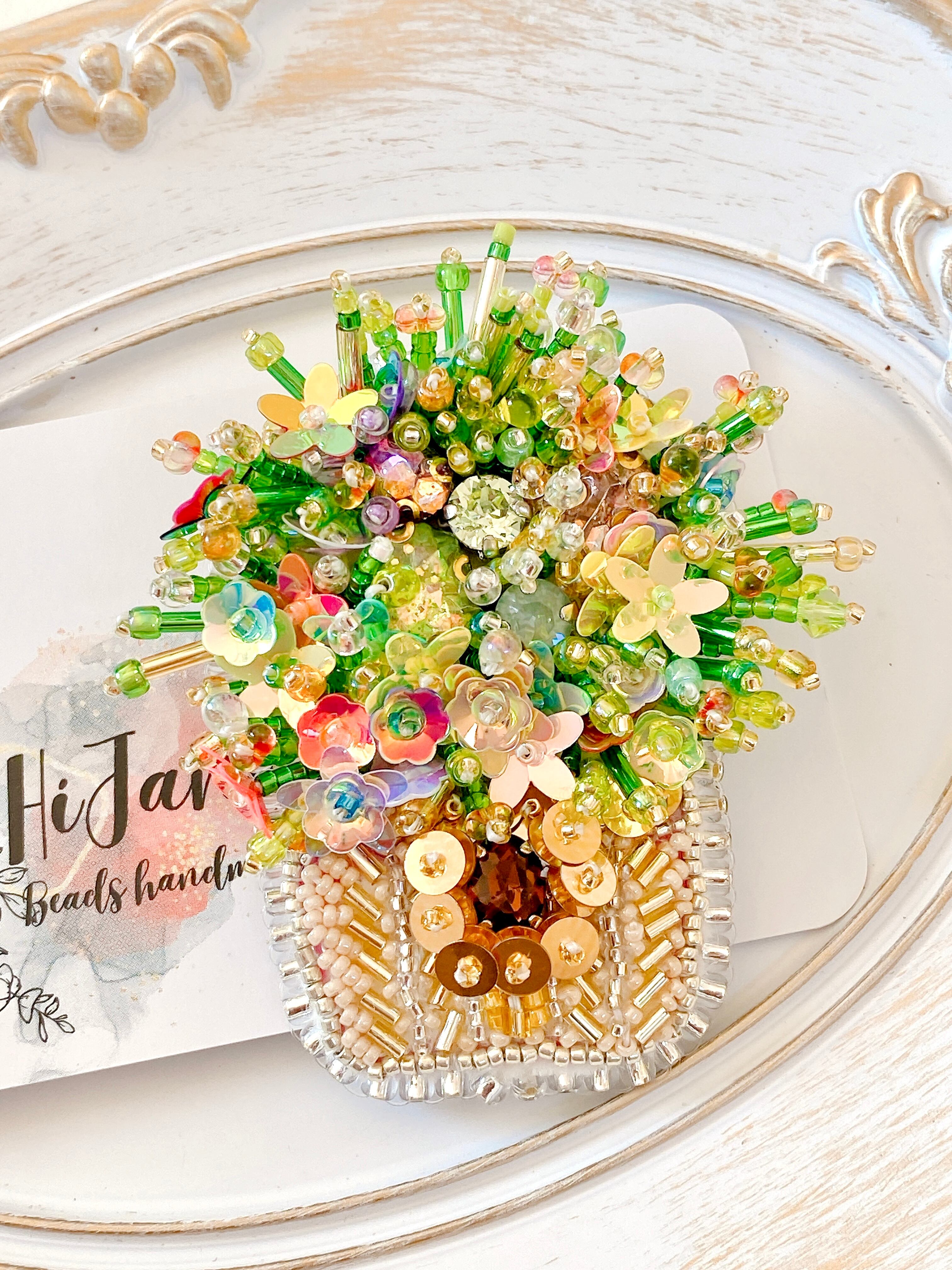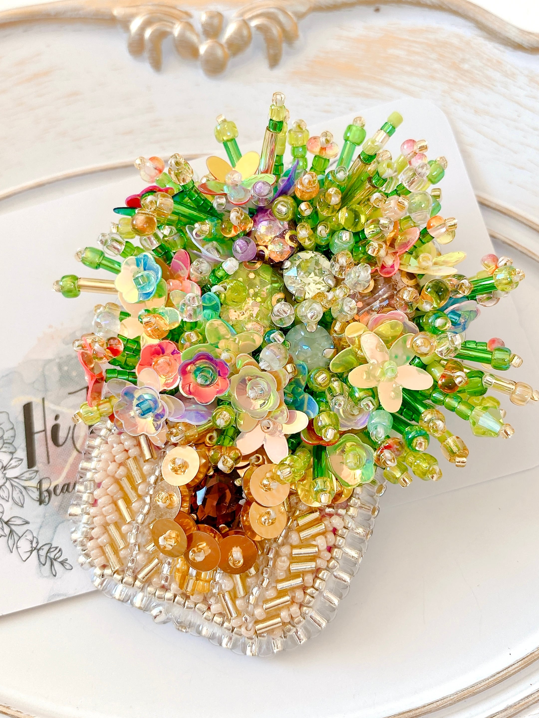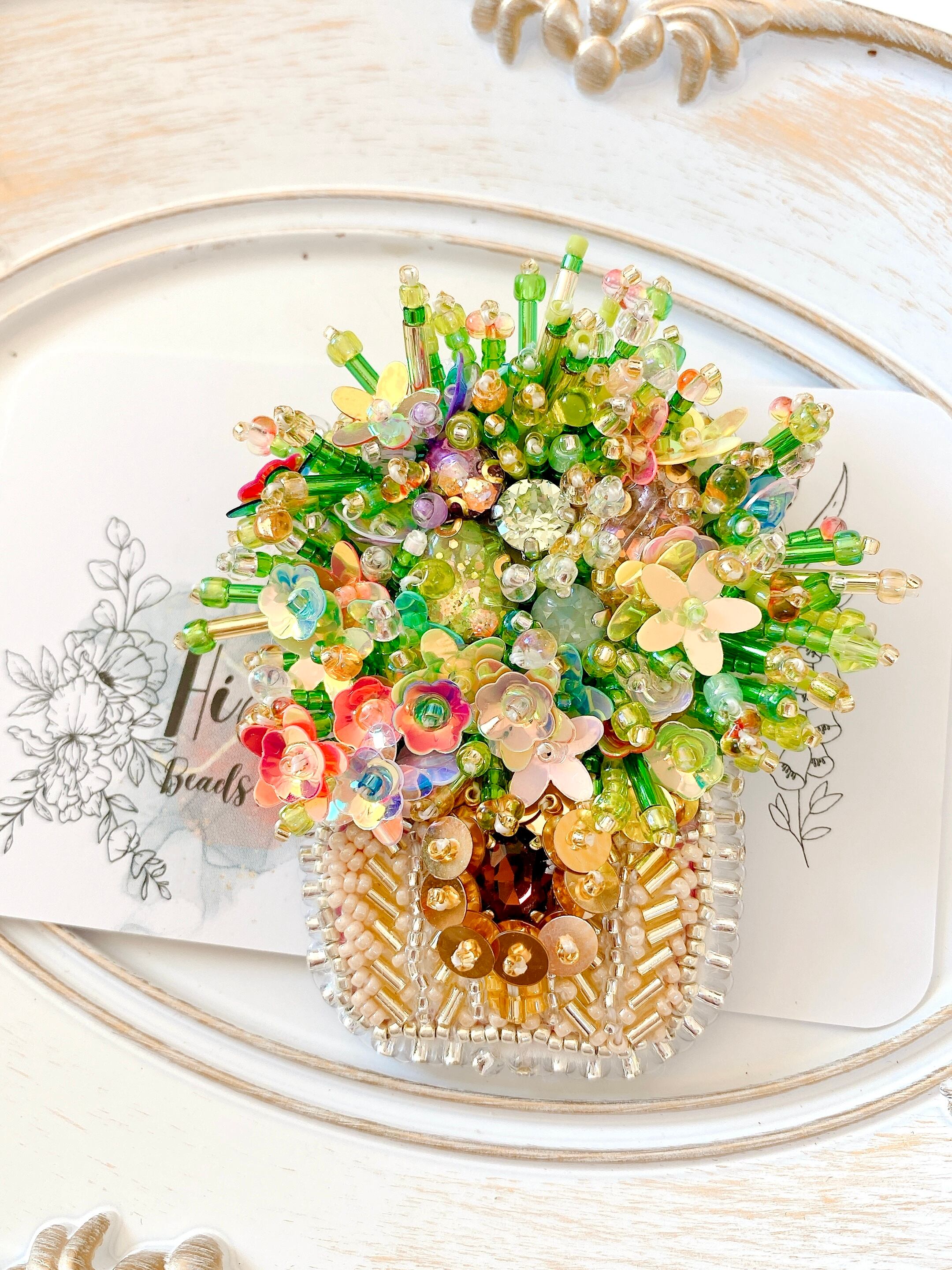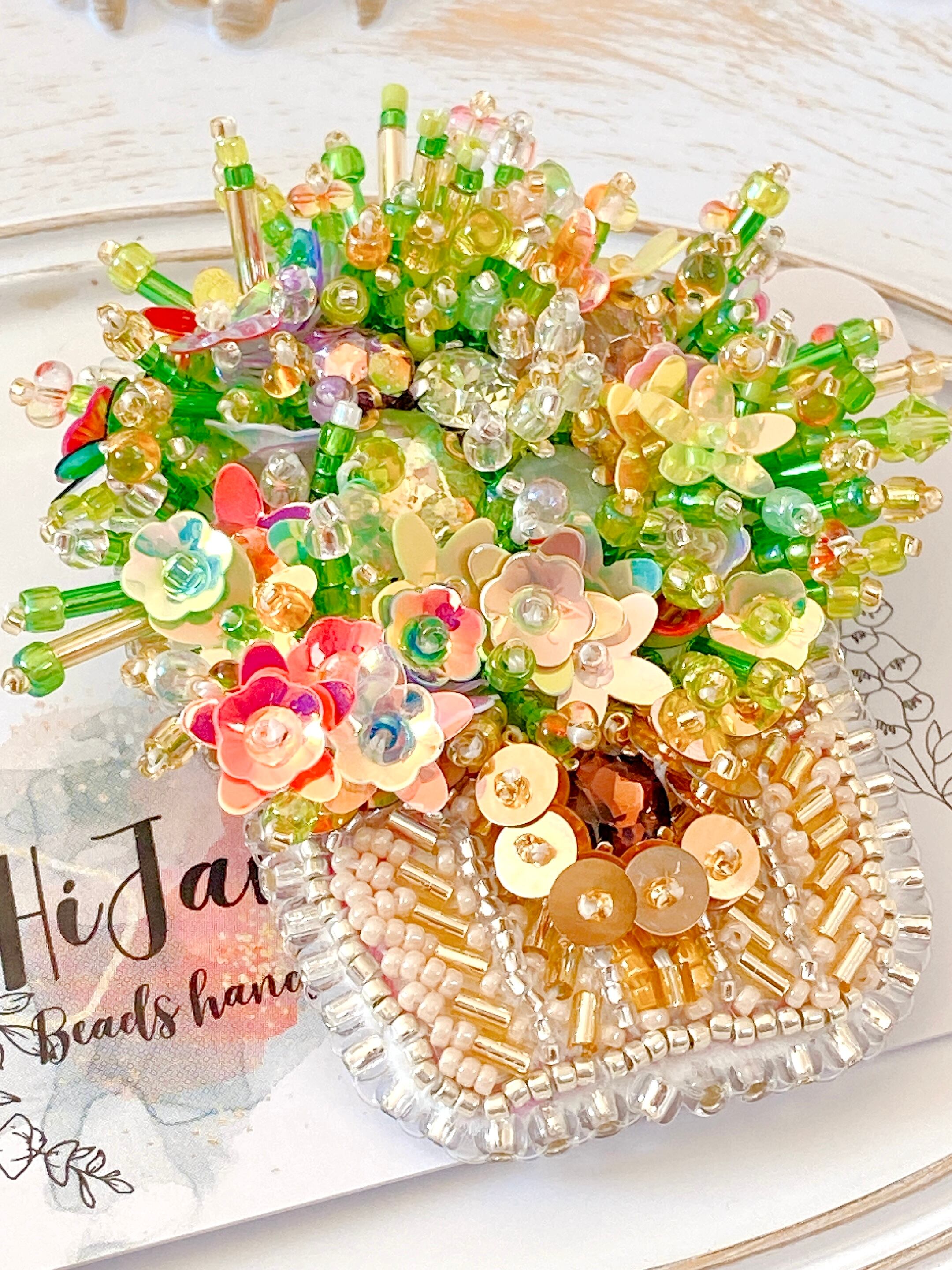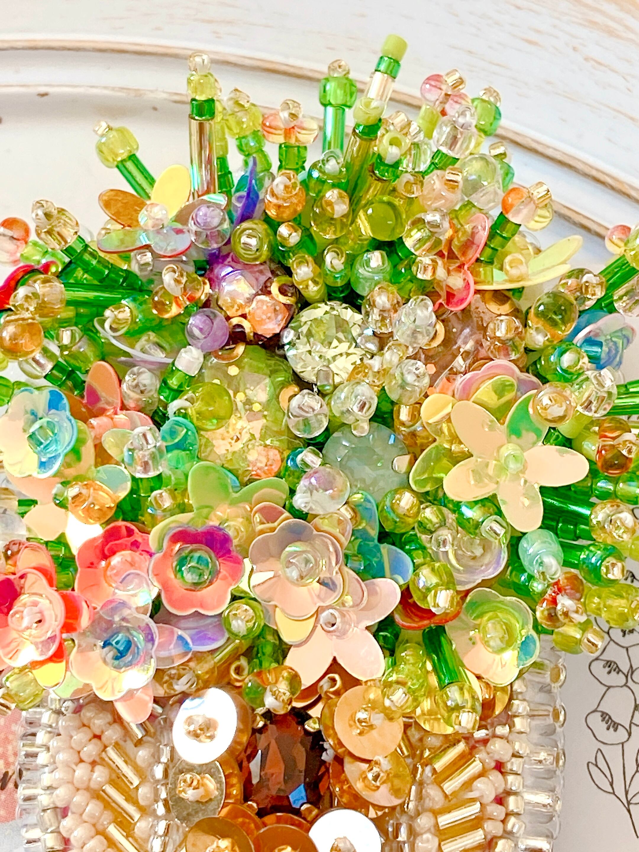 ふんわりとしたパステルカラーが可愛い、キャンディのような花束ブローチです。キラキラと輝くビーズやスパンコールをたっぷり使用し、立体的なデザインに仕上げました。お花畑をそのまま閉じ込めたような華やかさで、お洋服やバッグに付けるだけで、一気に華やかな印象になります。