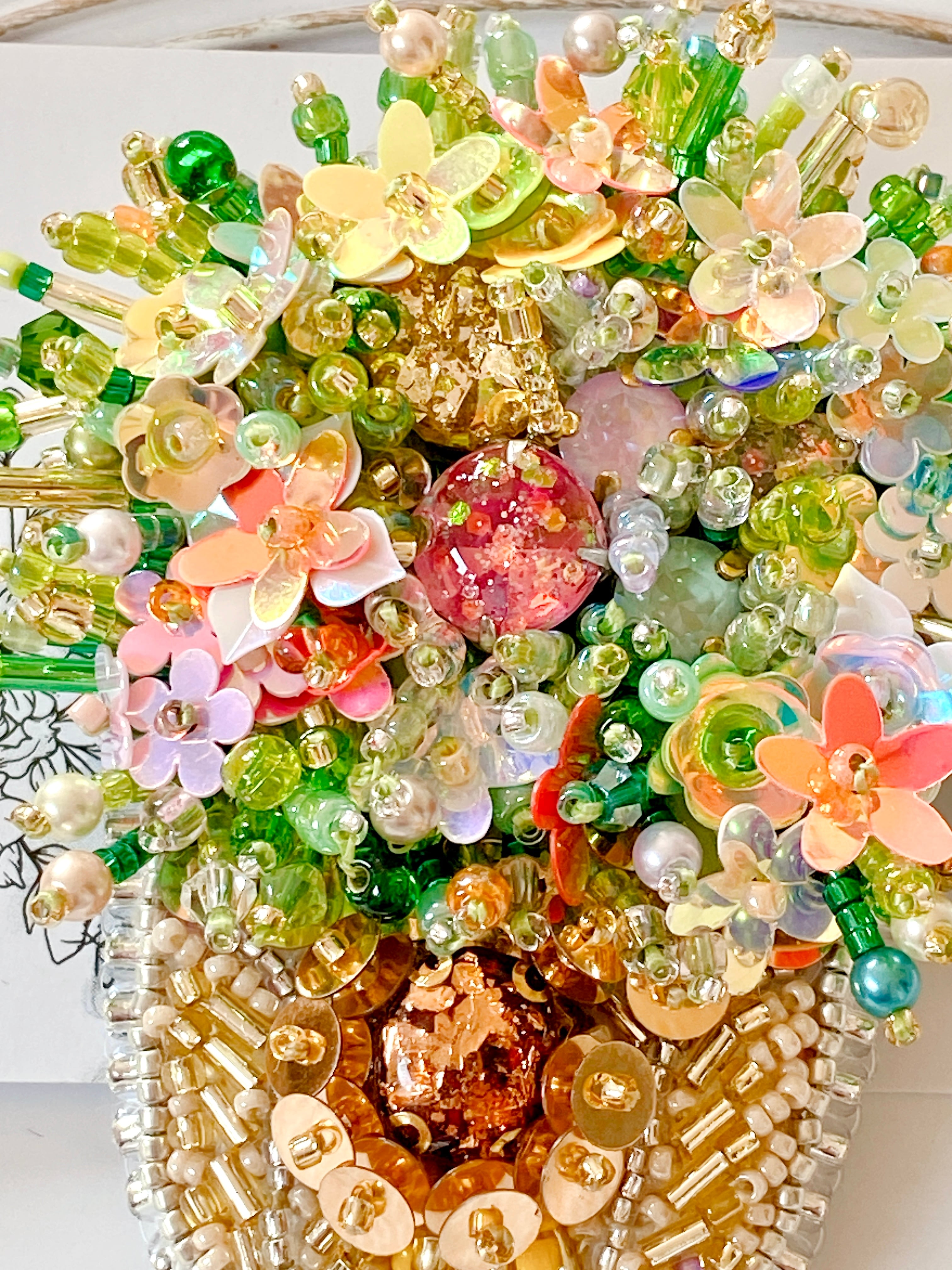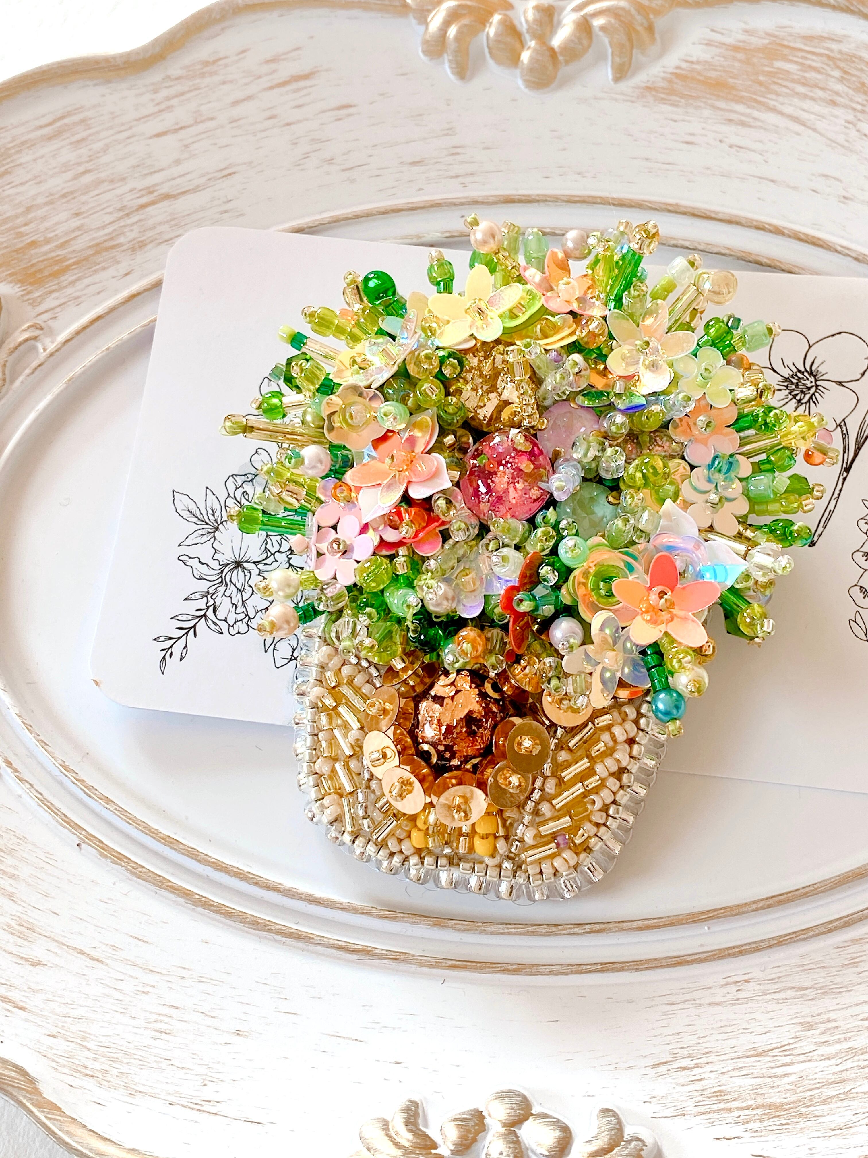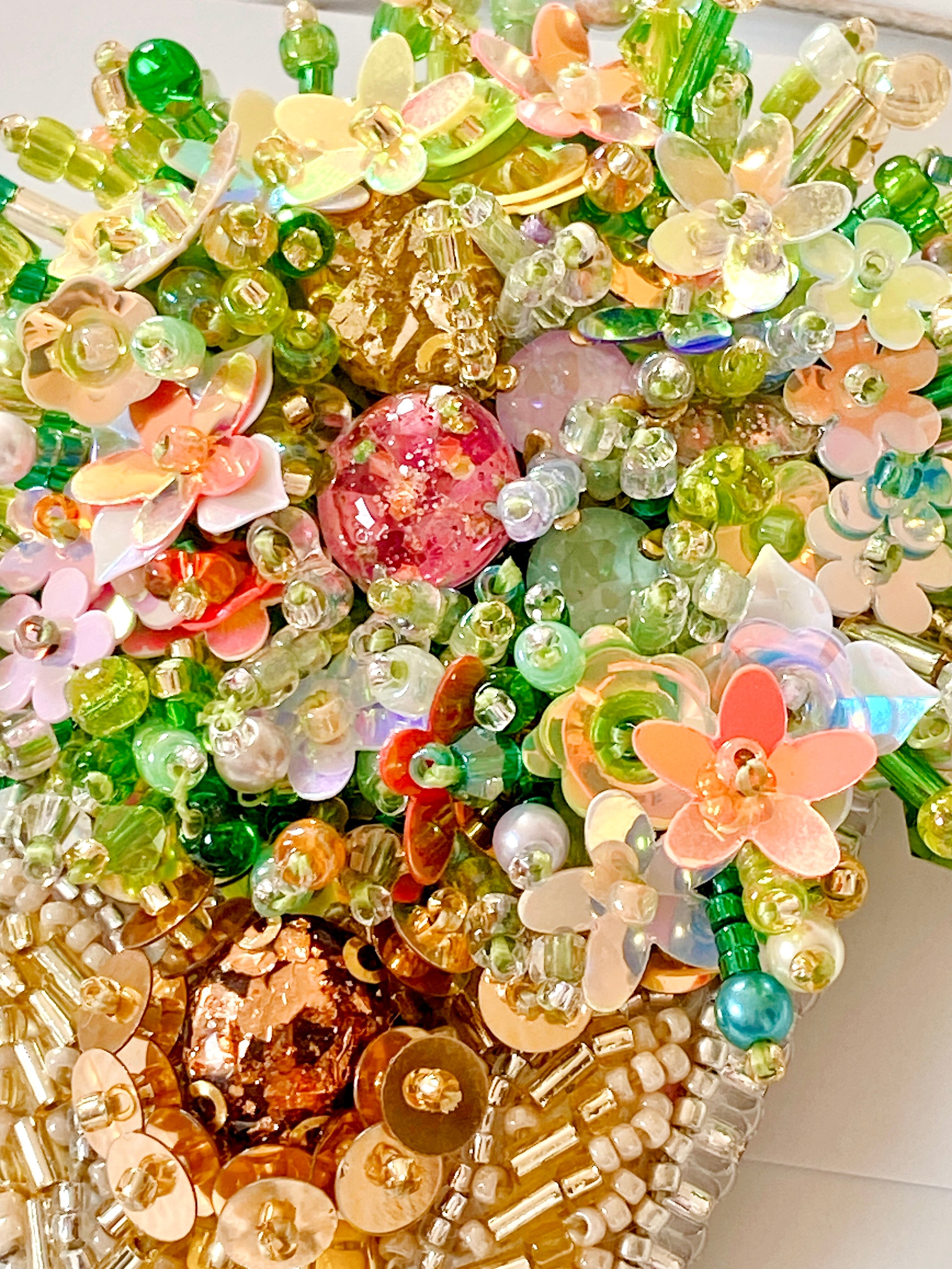 キラキラと光を反射するビーズやスパンコールをたっぷり使用し、お花畑をそのまま閉じ込めたような華やかさです。
