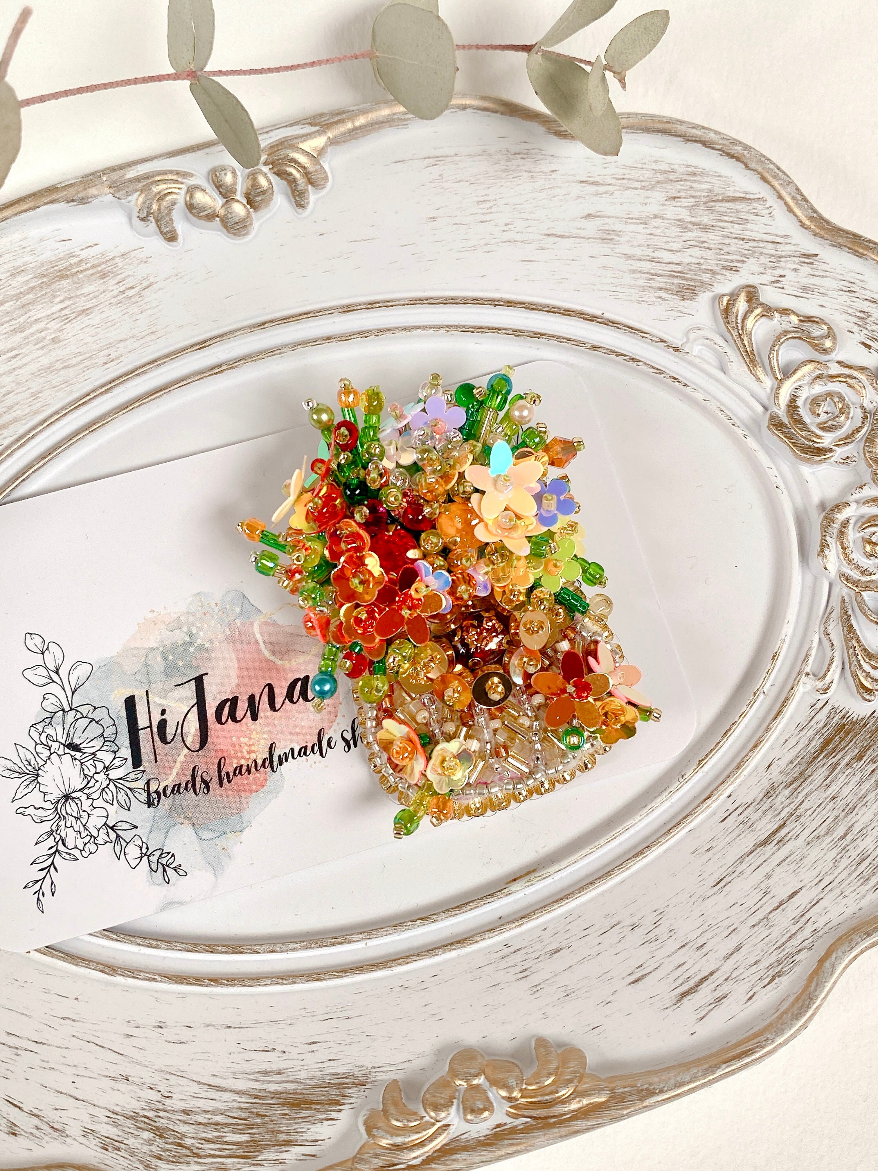 手のひらサイズの小さな花束のような、ビーズ刺繍のブローチです。