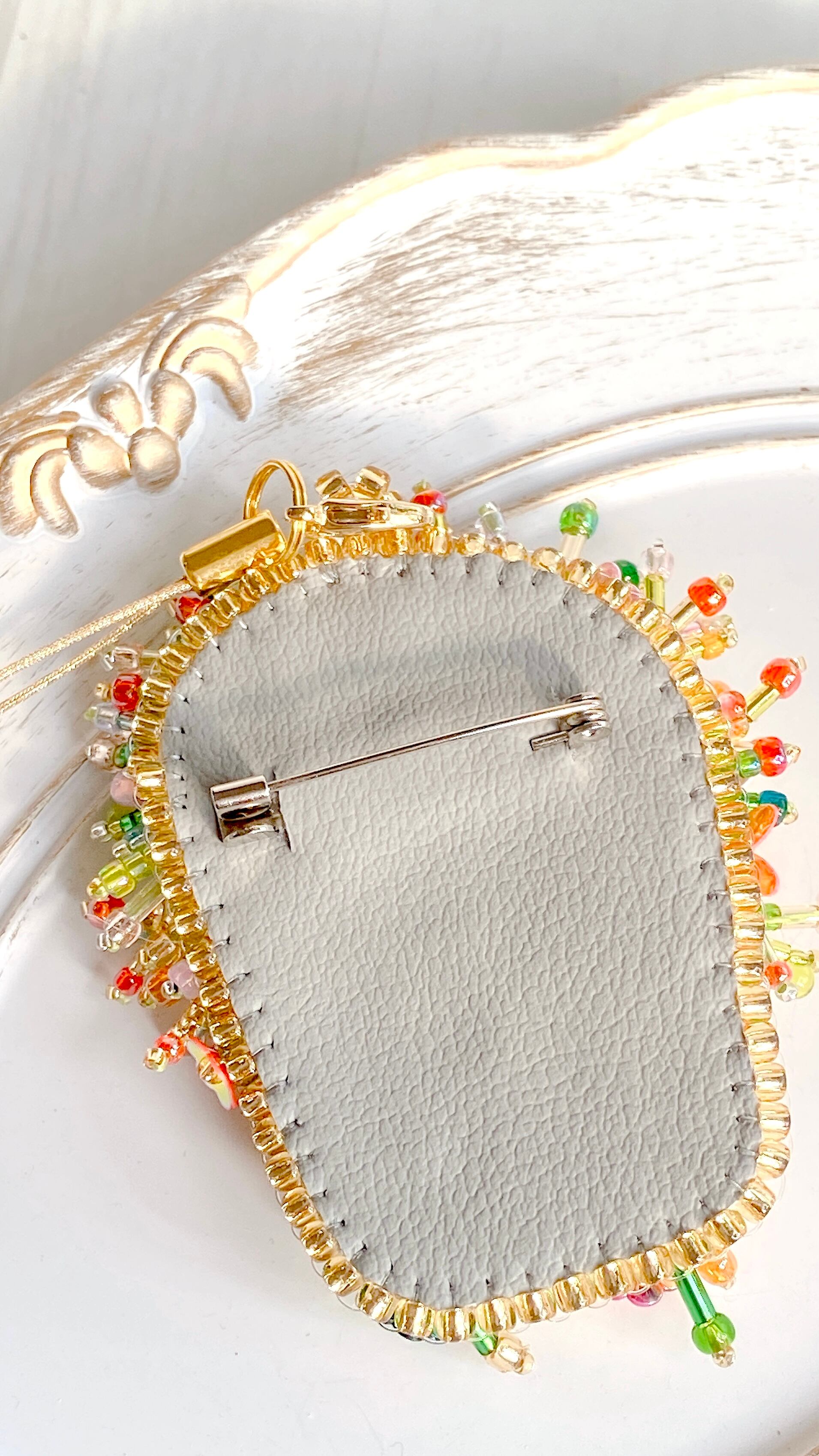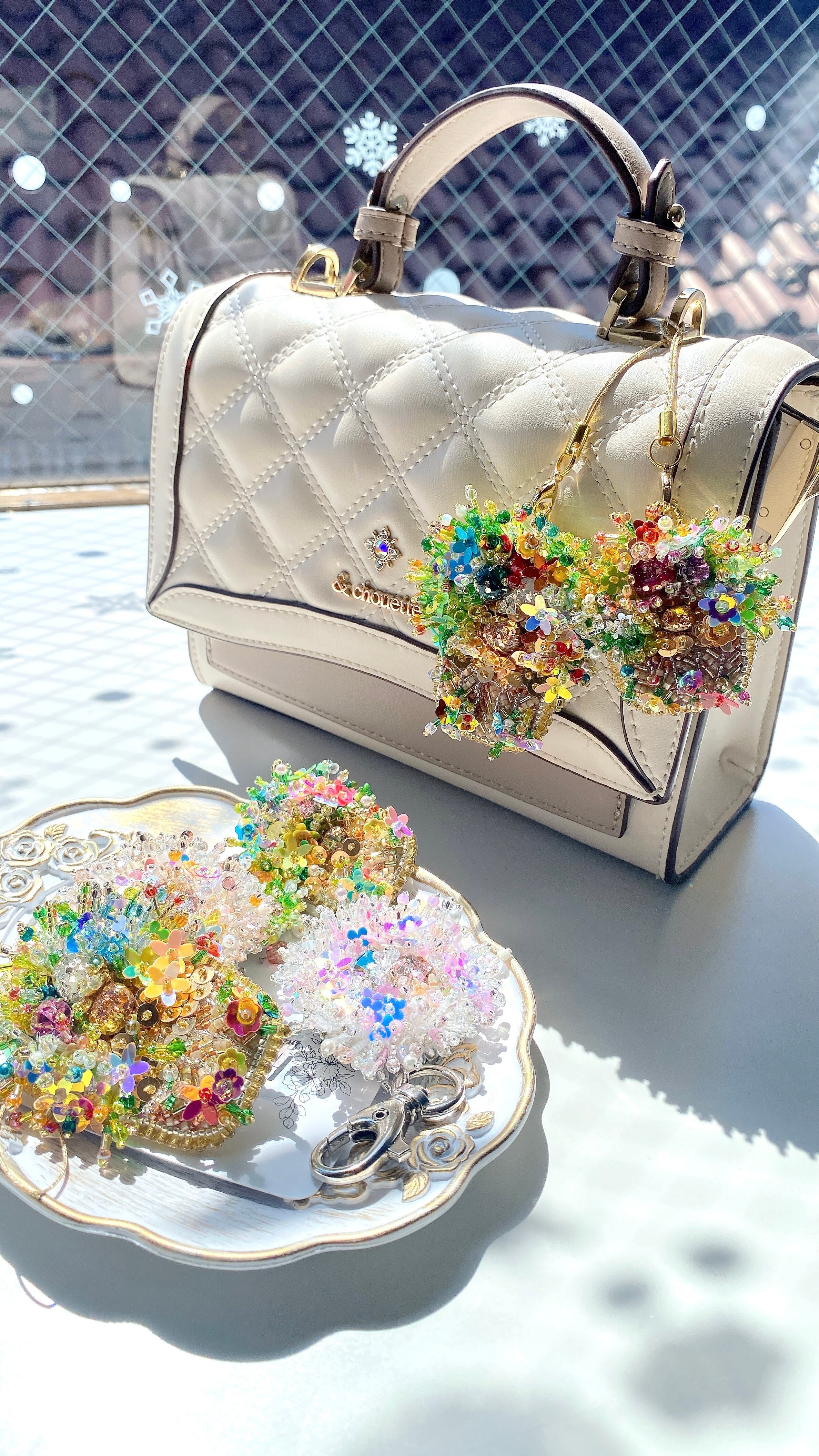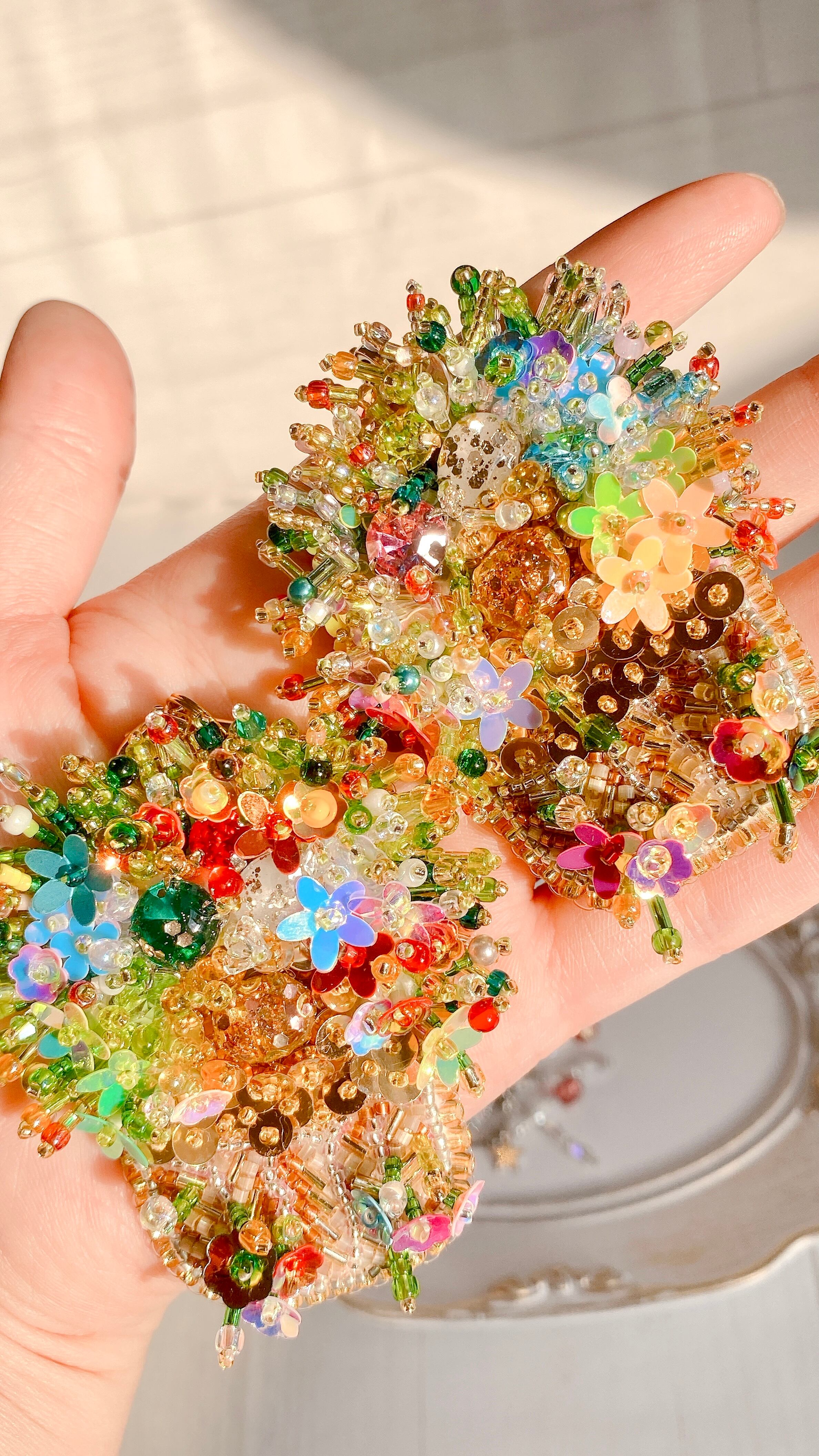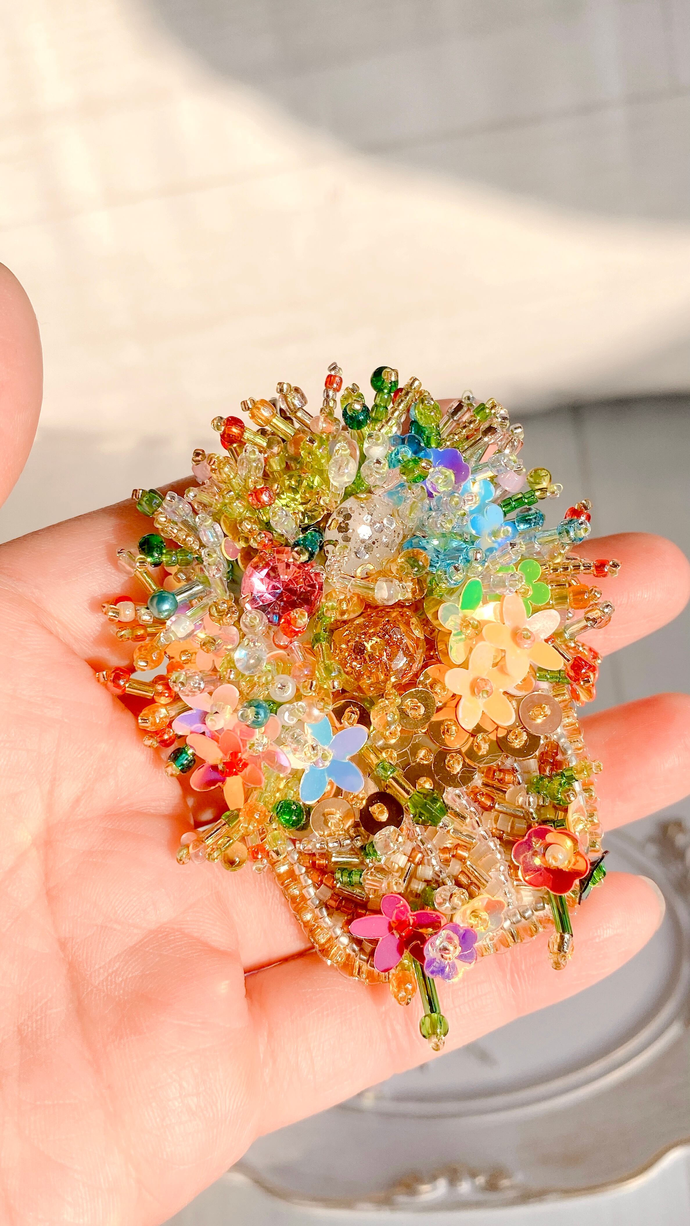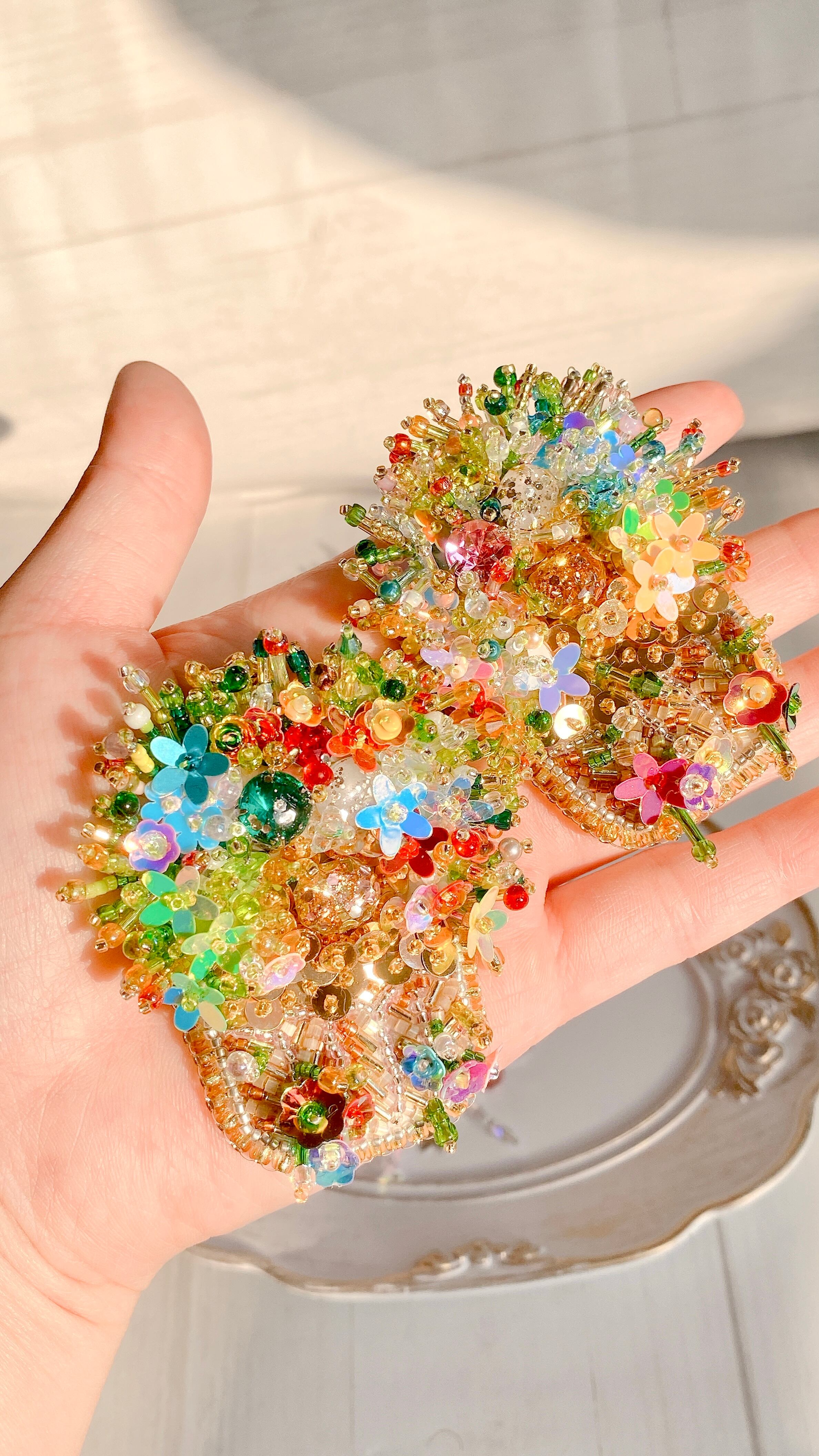 300粒以上のビーズとスパンコールを使用し、6時間以上かけて丁寧に仕上げた手刺繍の一点もの。