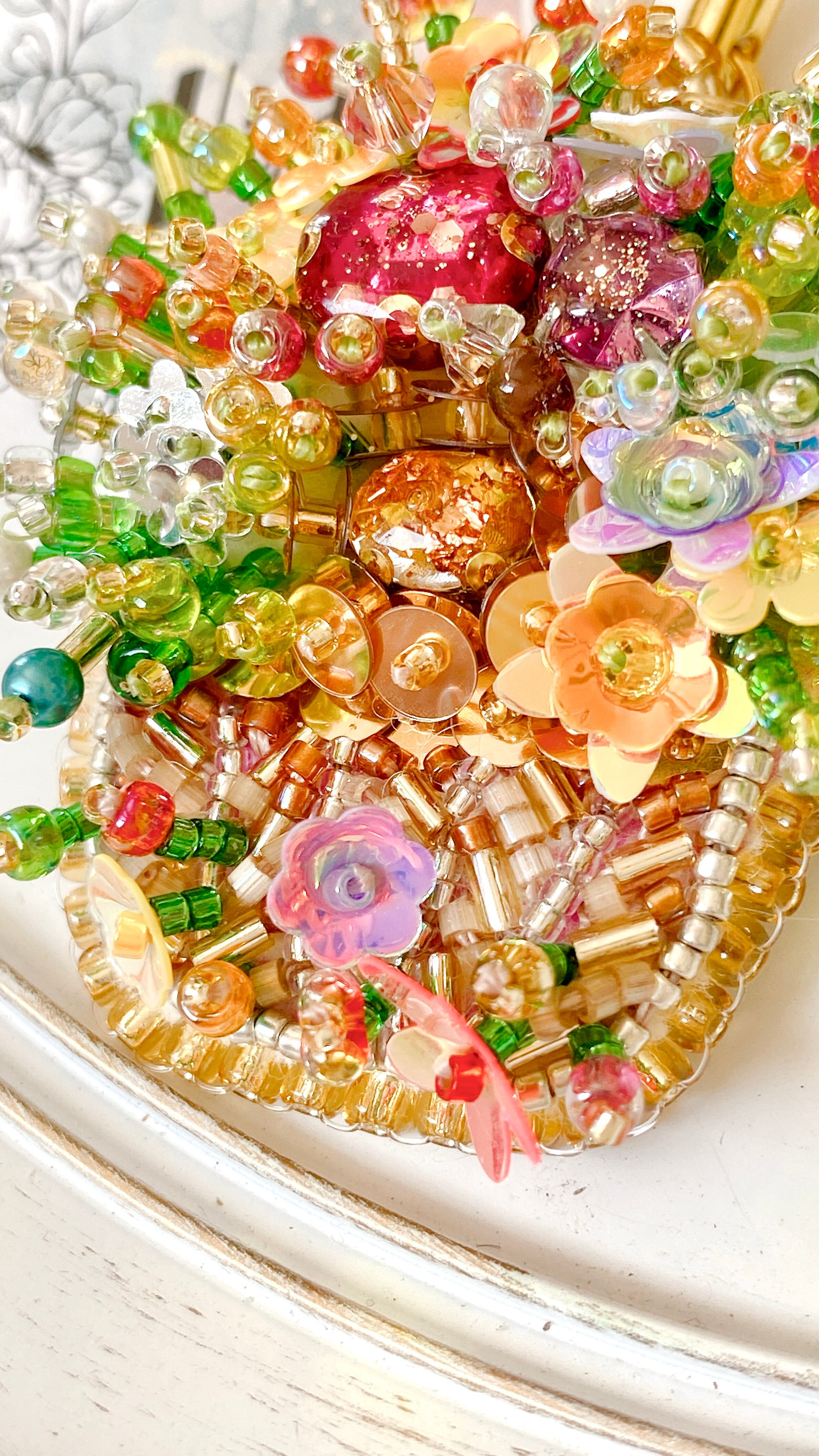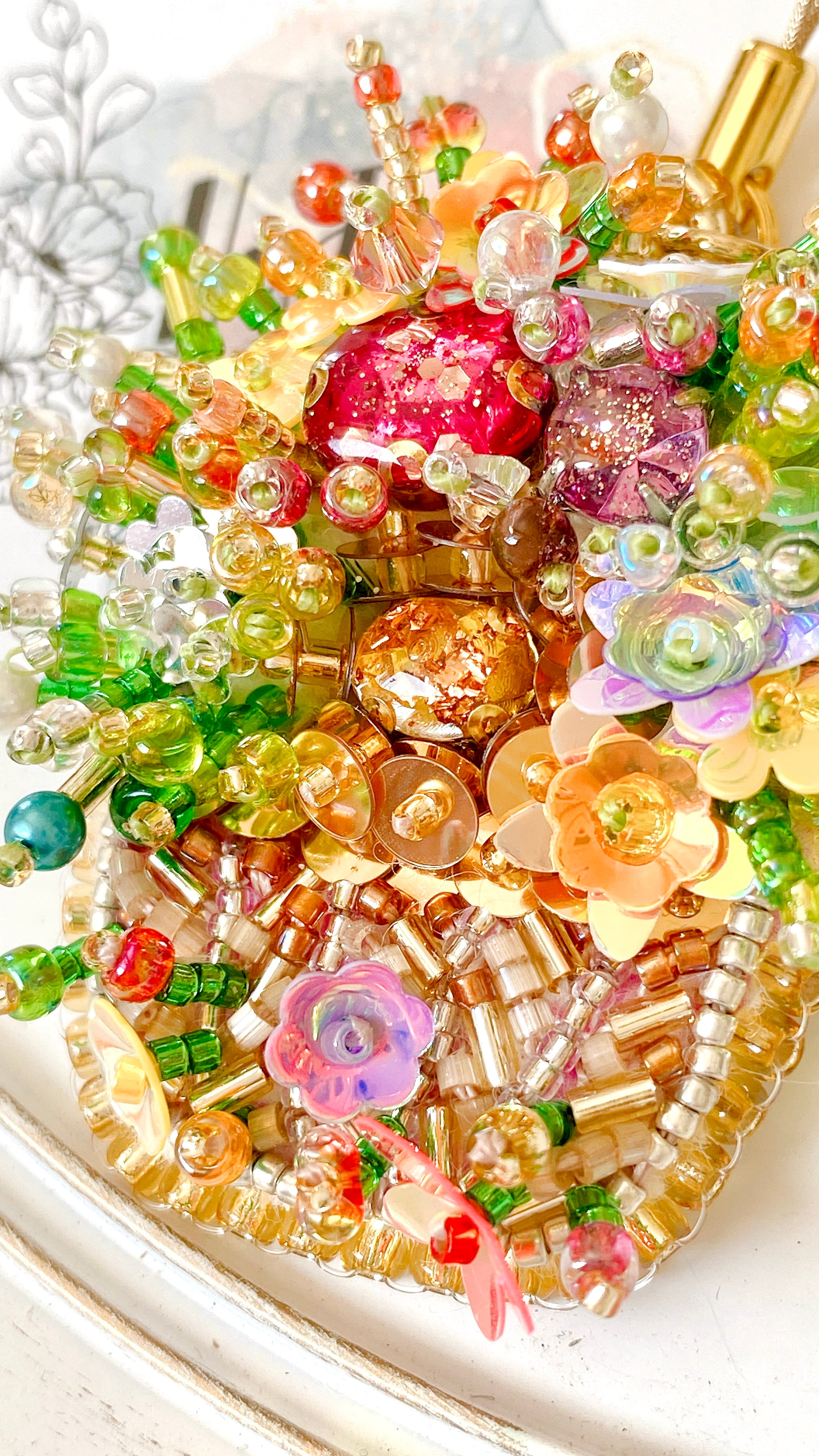 300粒以上のビーズとスパンコールを使用し、6時間以上かけて丁寧に仕上げた手刺繍の一点もの。