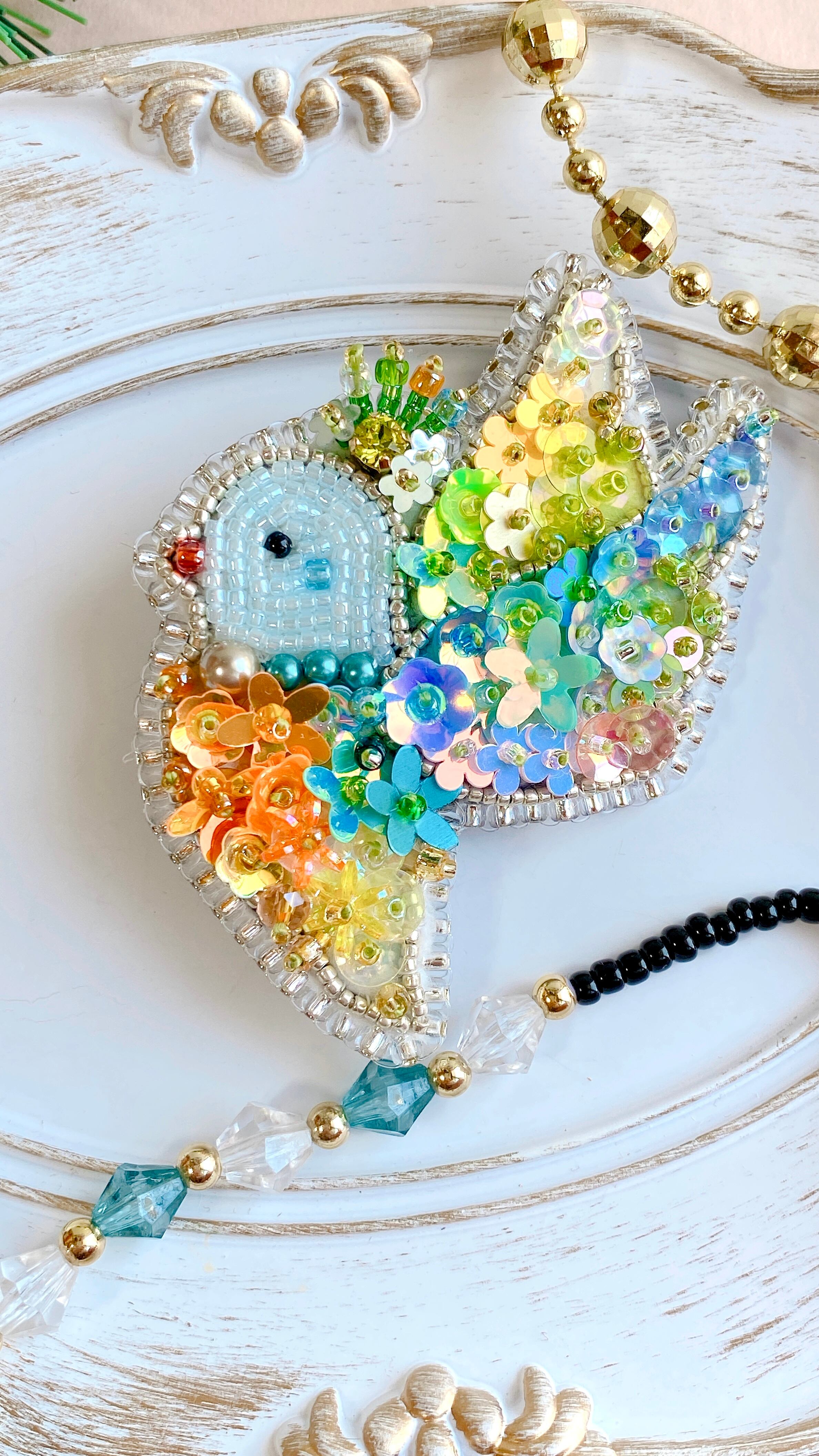 300粒以上のビーズを使い、5時間以上かけて丁寧に仕上げた手刺繍の一点もの。