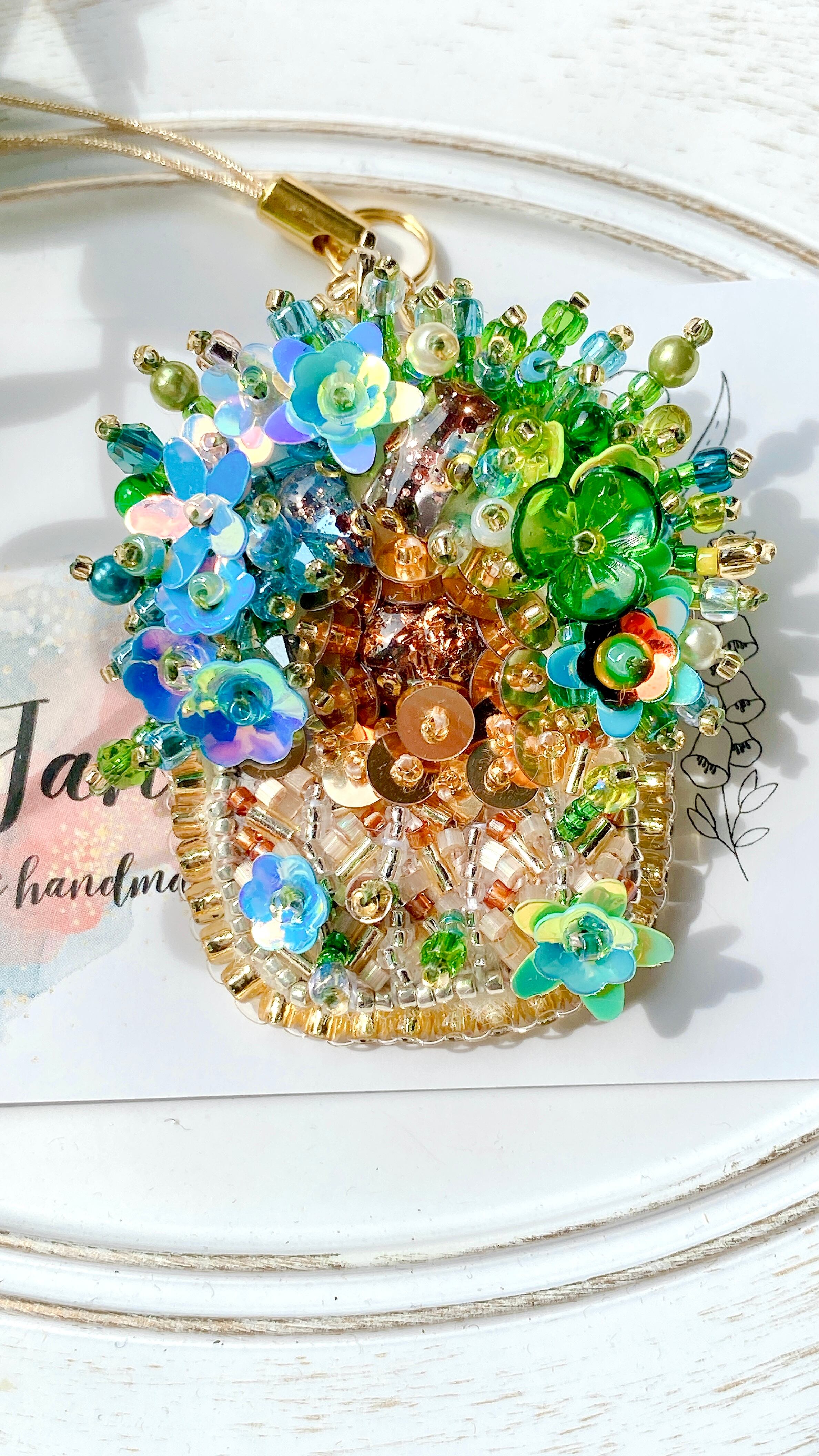 緑の中に、優しい色のお花やビーズが咲きこぼれ、