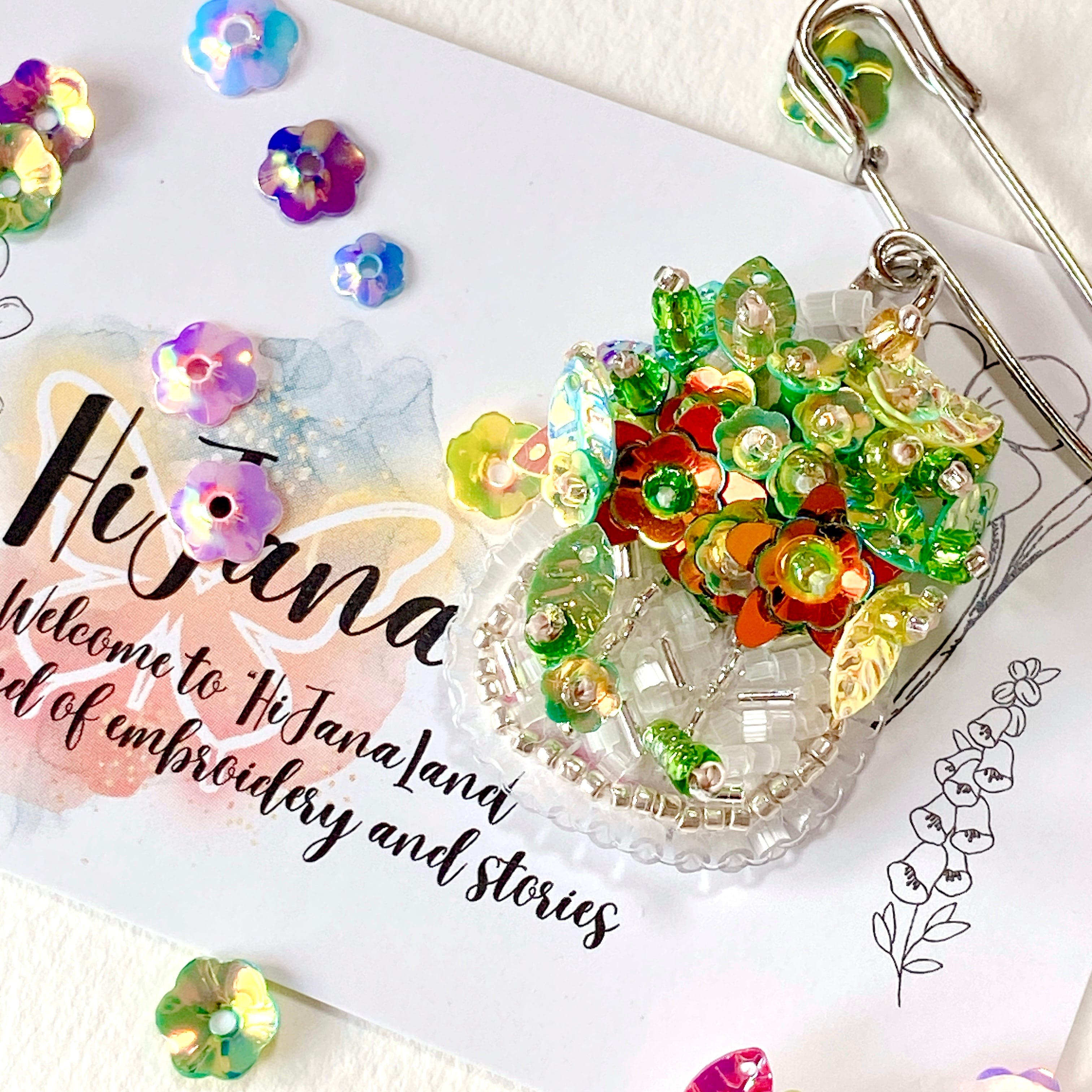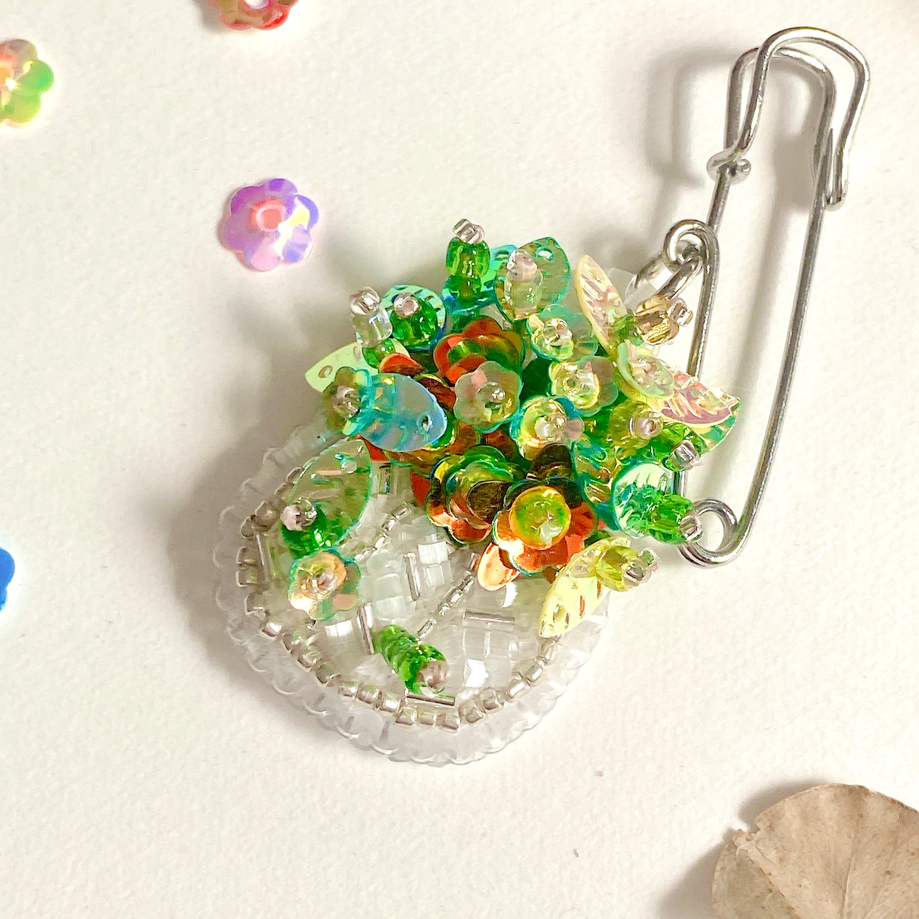 ビーズ刺繍で仕立てたミニ鉢花。