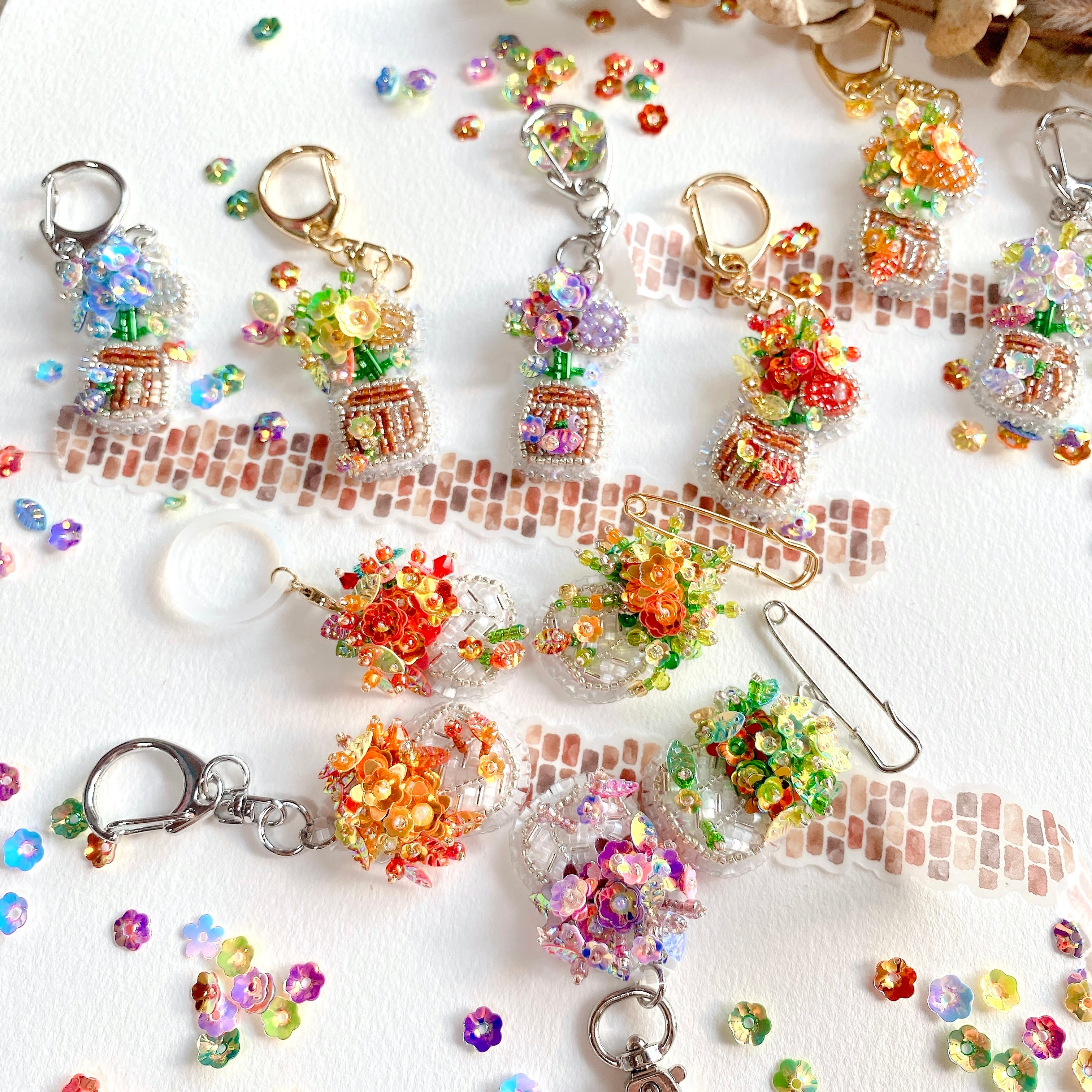 キーホルダー、ブローチピン、アンブレラマーカーなど、