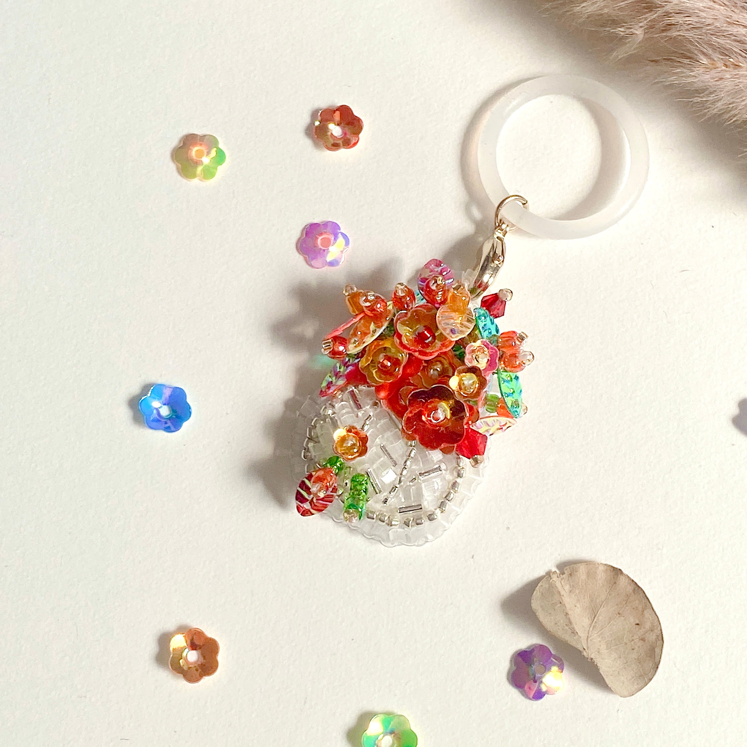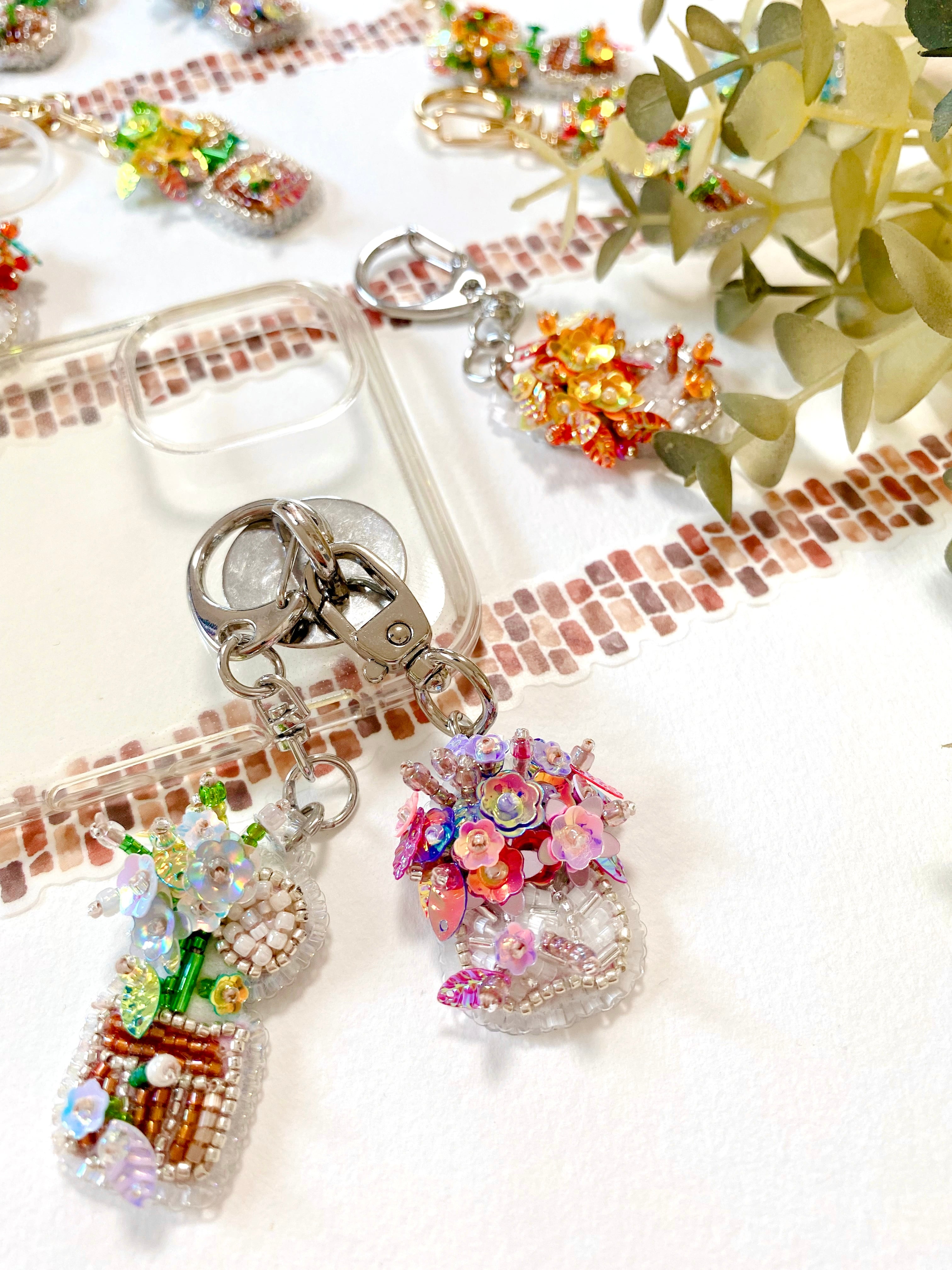 ビーズ刺繍で仕立てたミニ鉢花。