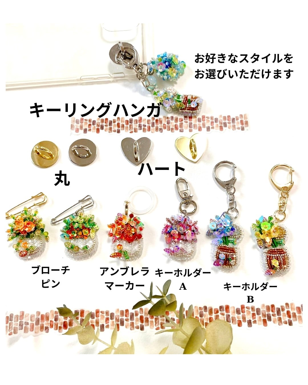 キーホルダー、ブローチピン、アンブレラマーカーなど、