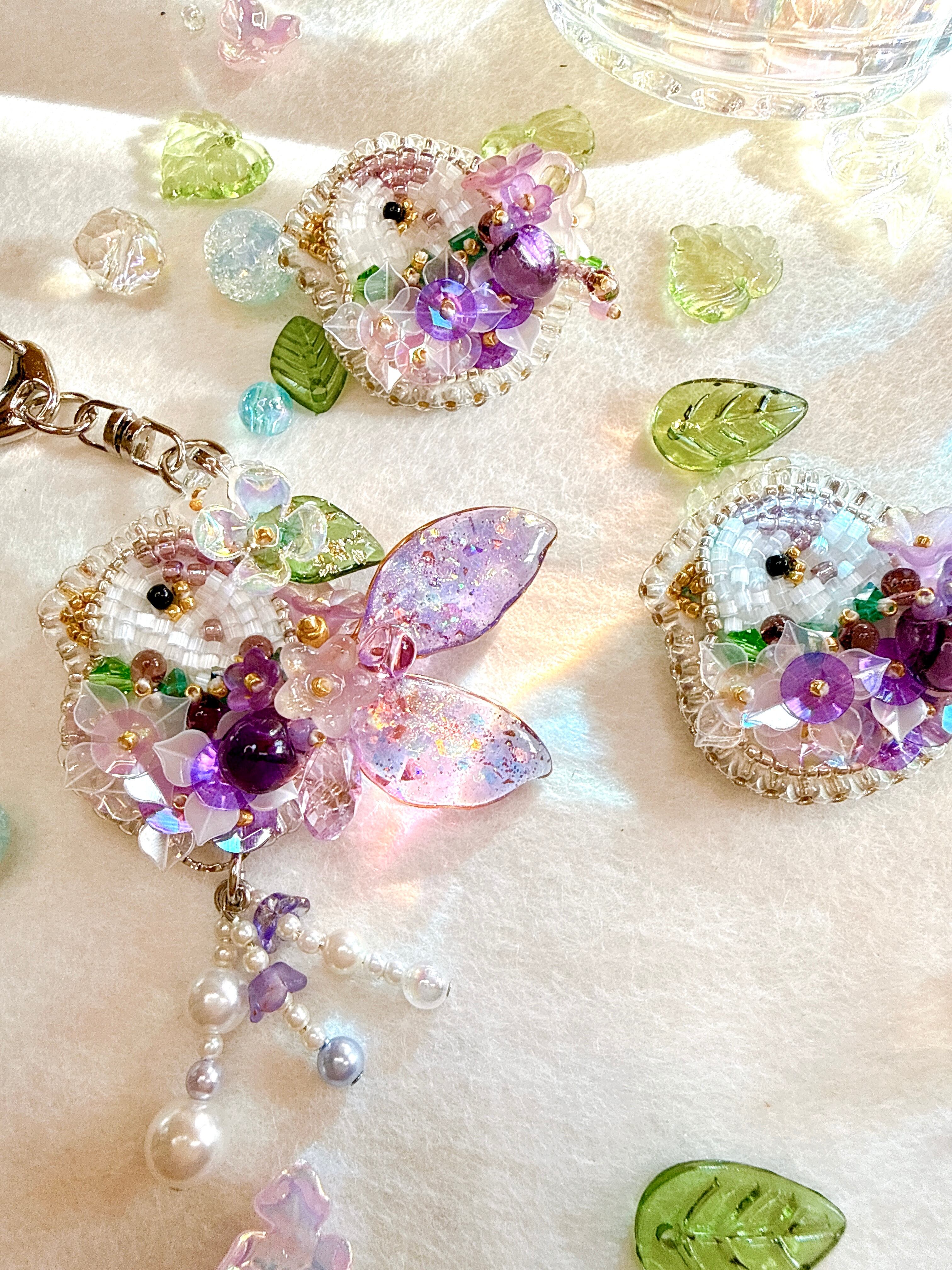 紫の花が咲く幻想の庭を立体刺繍で表現しました。